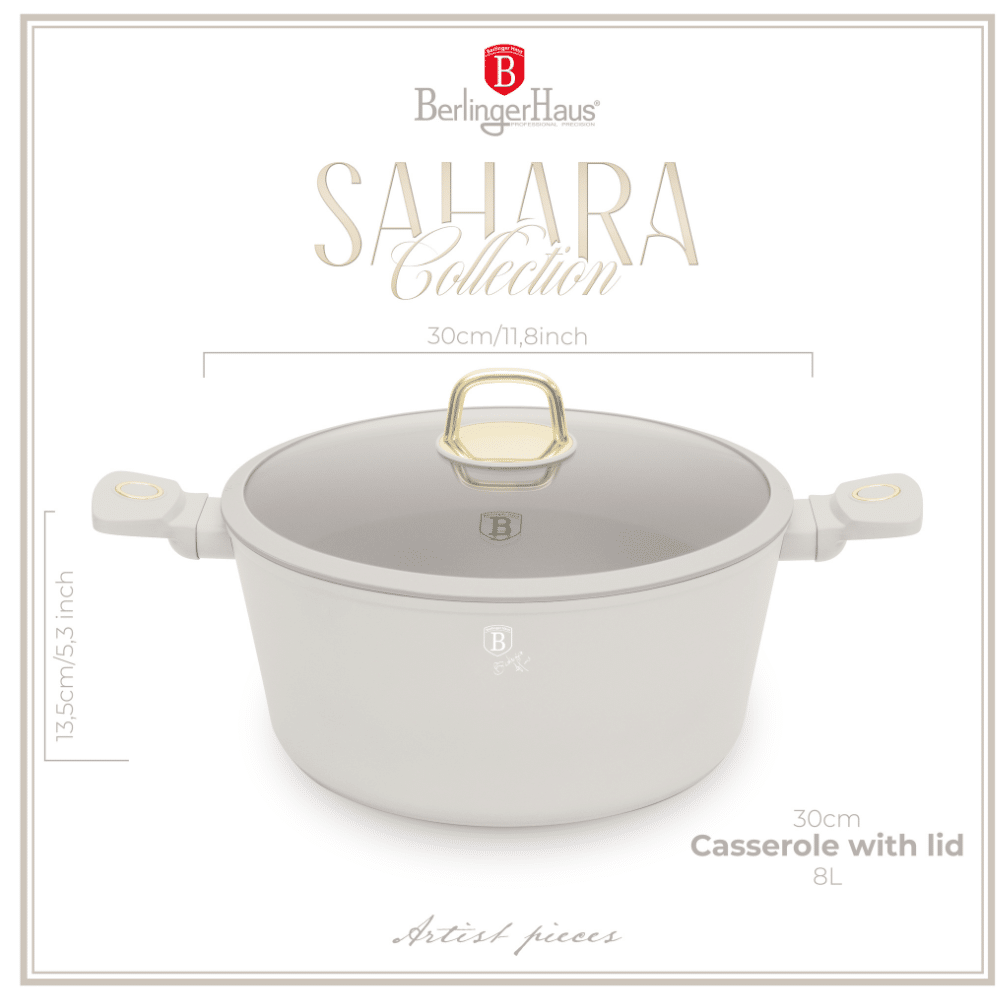 The Berlinger Haus BH8073 Casserole is crafted from forged aluminum, which ensures even heat distribution across the surface. As a result, your food cooks perfectly every time without any hotspots. The Titan Pro non-stick coating—with its 3-layer durability—not only makes cooking easier but also allows for healthier meals with less oil. With a generous 8L capacity, this casserole is perfect for large families or when entertaining guests.