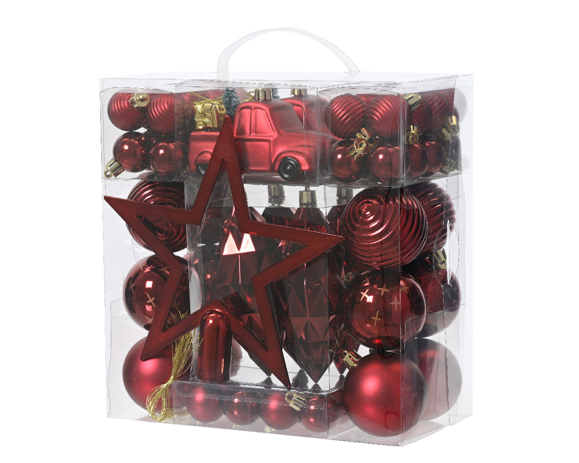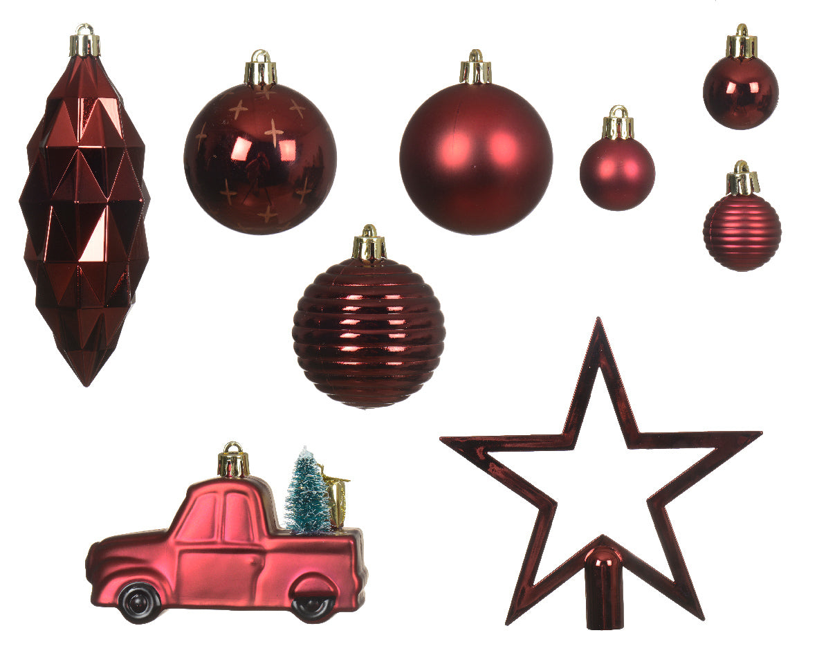 Decoris Baubles Shatterproof Shiny Matt Mix Clear Box Cars/Star/Tree Topper Oxblood 67ct