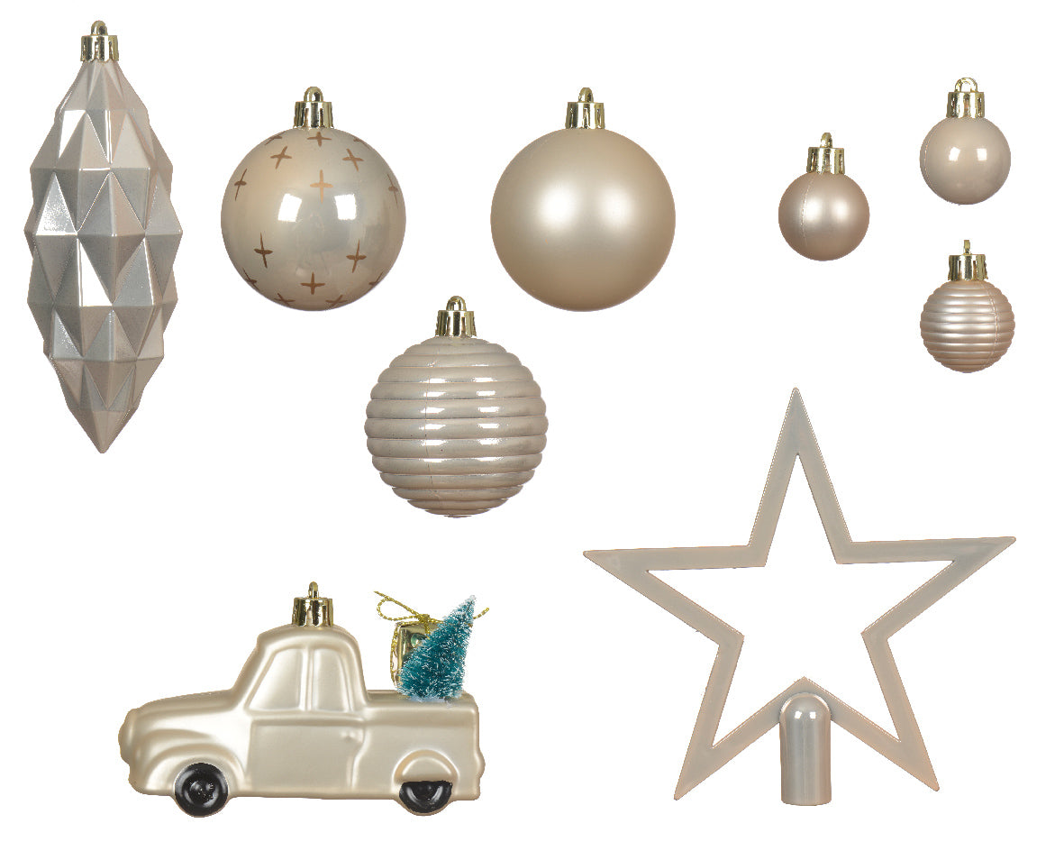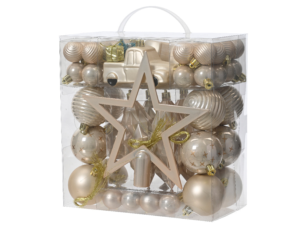 Decoris Baubles Shatterproof Shiny Matt Mix Clear Box Cars/Star Tree Topper Pearl 67ct