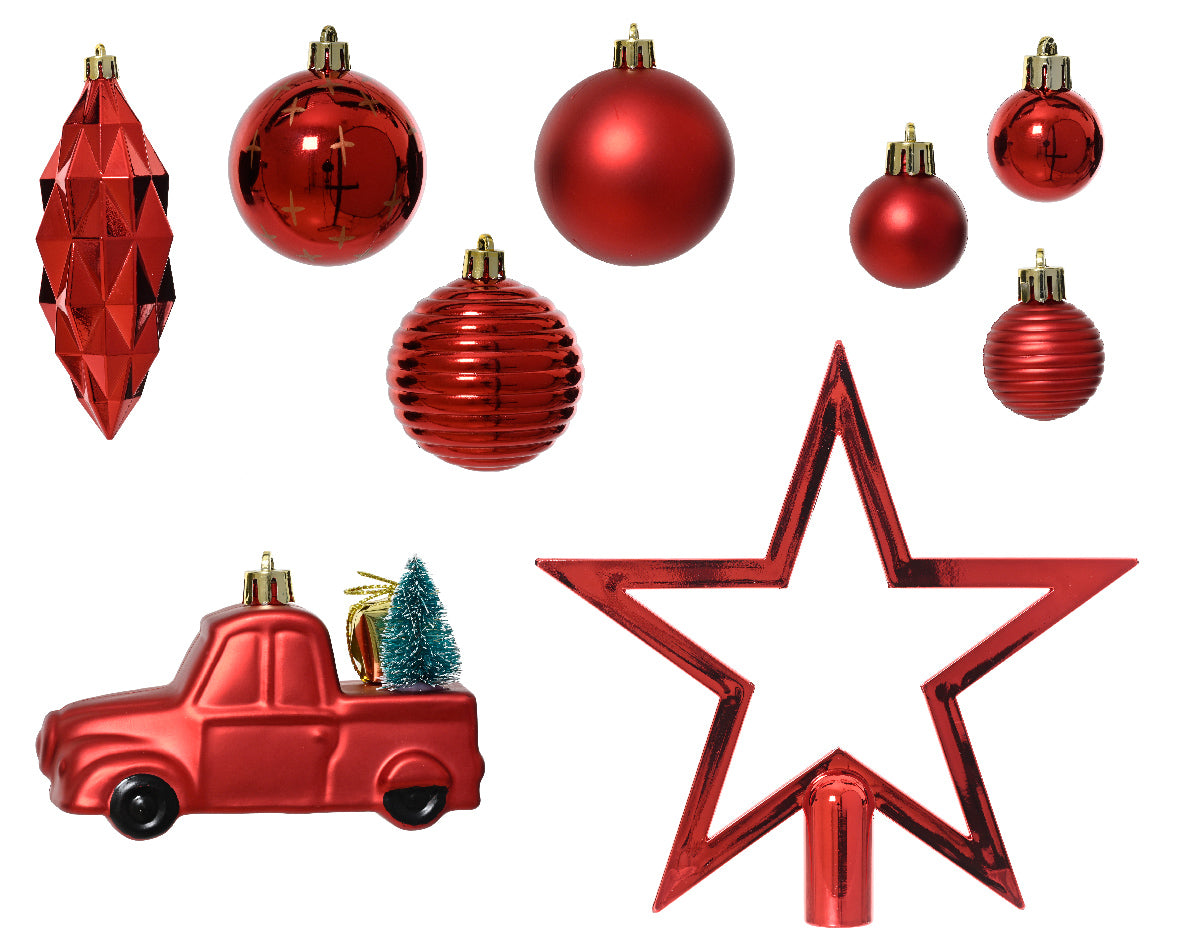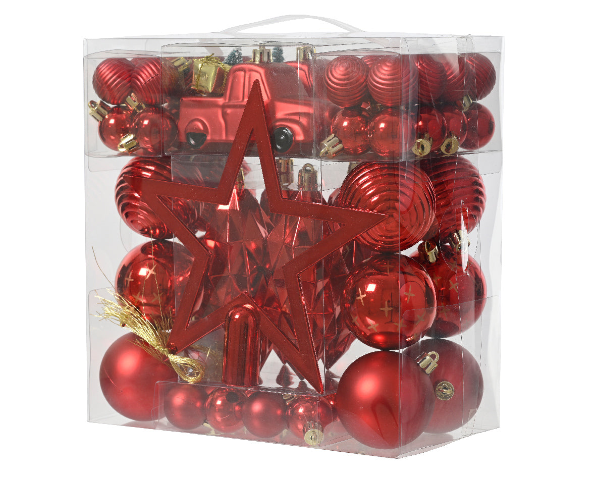 Decoris Baubles Shatterproof Shiny Matt Mix Clear Box Cars/Star/Topper Christmas Red 67ct