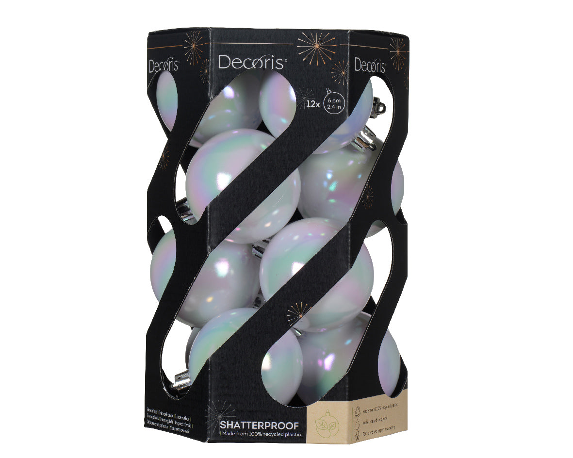 Decoris Recyclable Package Baubles Shatterproof Shiny Matt Mix 6cm White Iridescent 12ct