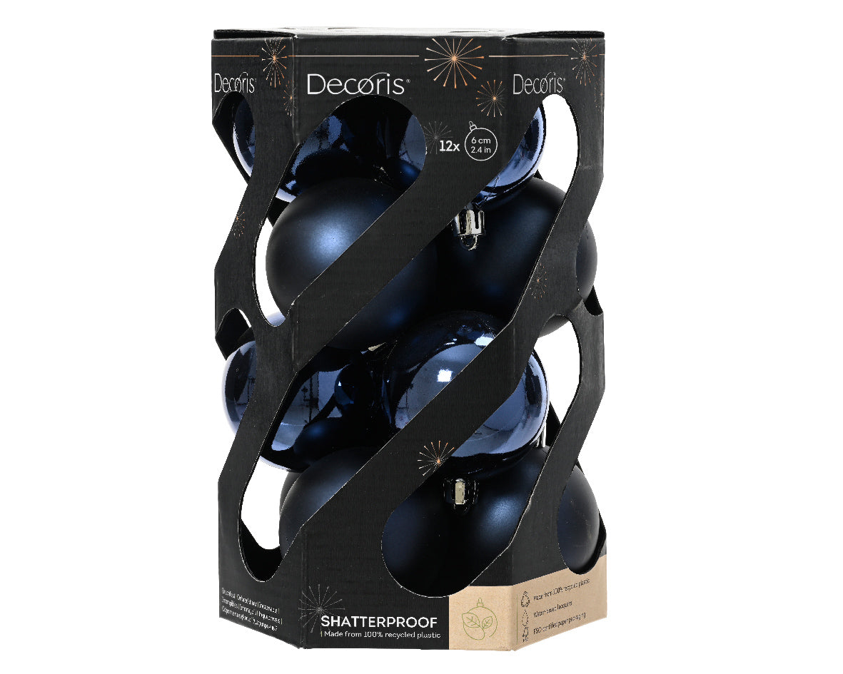 Decoris Recyclable Package Baubles Shatterproof Shiny Matt Mix 6cm Night Blue 12ct