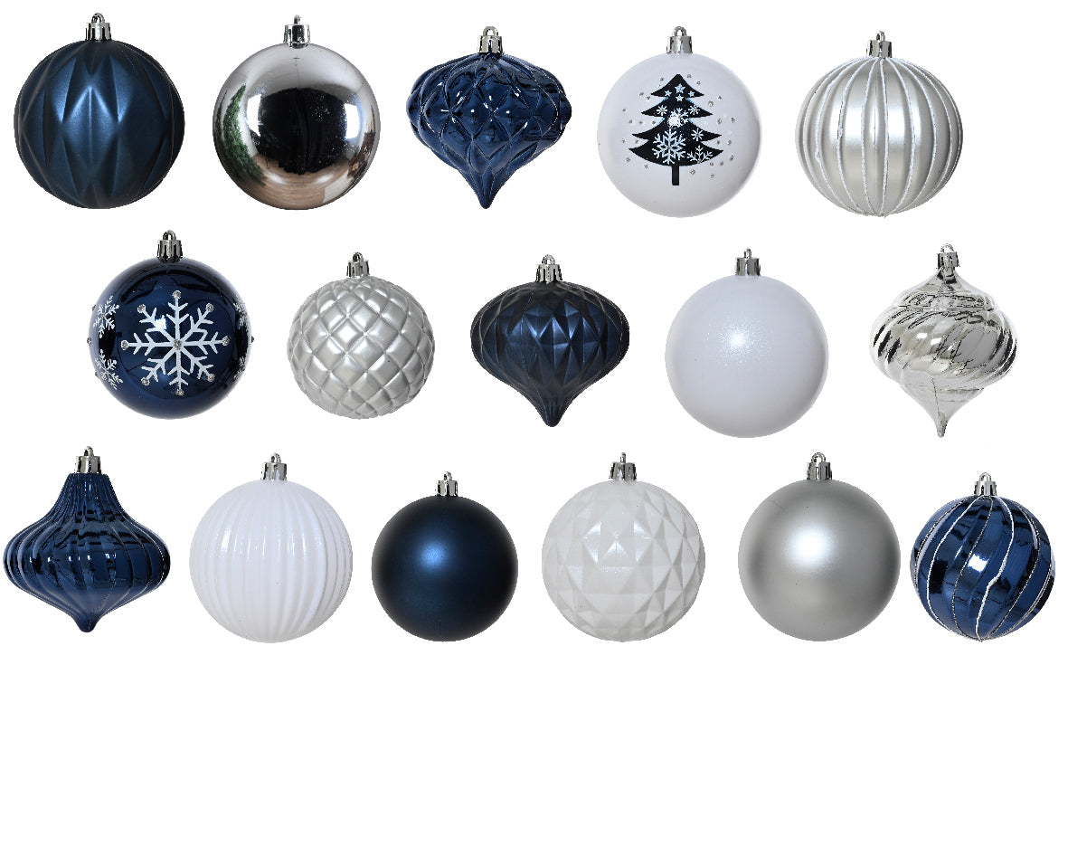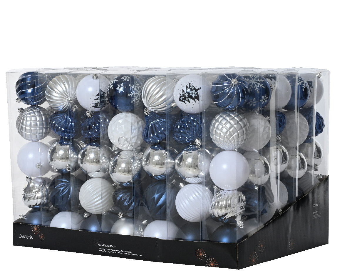 Decoris Baubles Shatterproof Shiny Matt Mix 8cm Clear Tube White Silver Blue 5ct