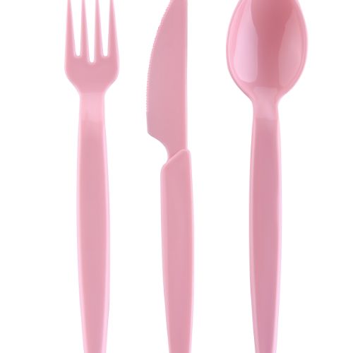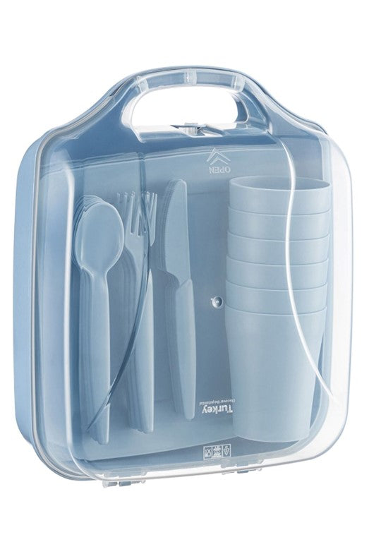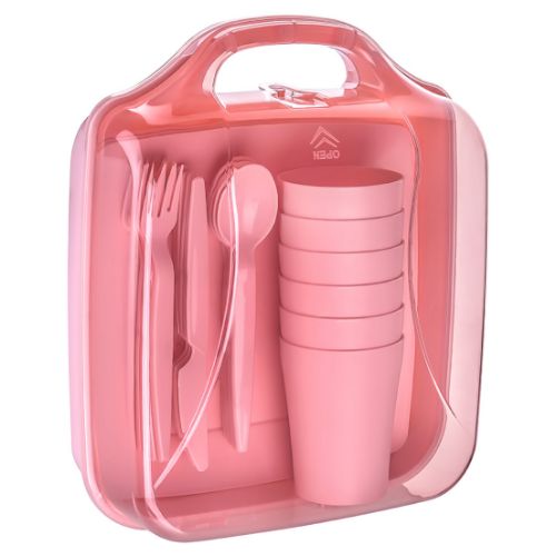 Set contains the following Spoon, Fork, Cup and Plates x 6. Assorted colours in Grey, Maroon, Pink.