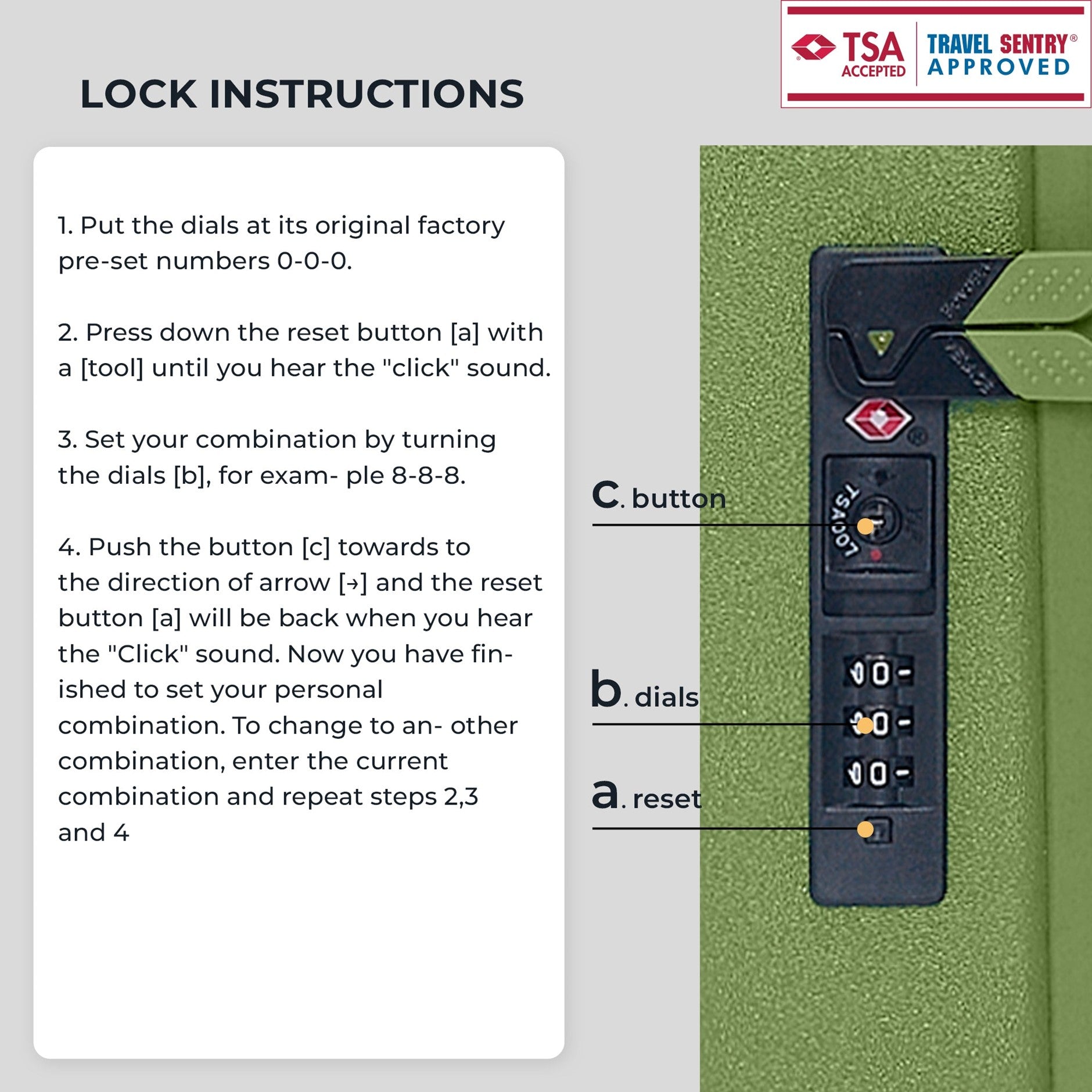 - TSA Lock: Default password is 0-0-0. Instructions are located in the mesh pocket inside the suitcase.