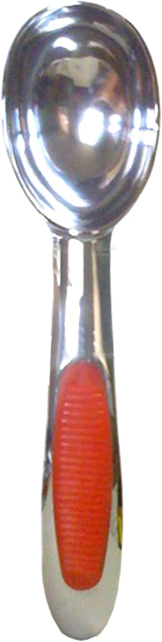 Ice cream scoop efficiently scoops ice cream neatly and with ease. Scoop is composed of heavy duty zinc to ensure reliability and durability. Red rubber non-slip grips line the handle for efficient use.