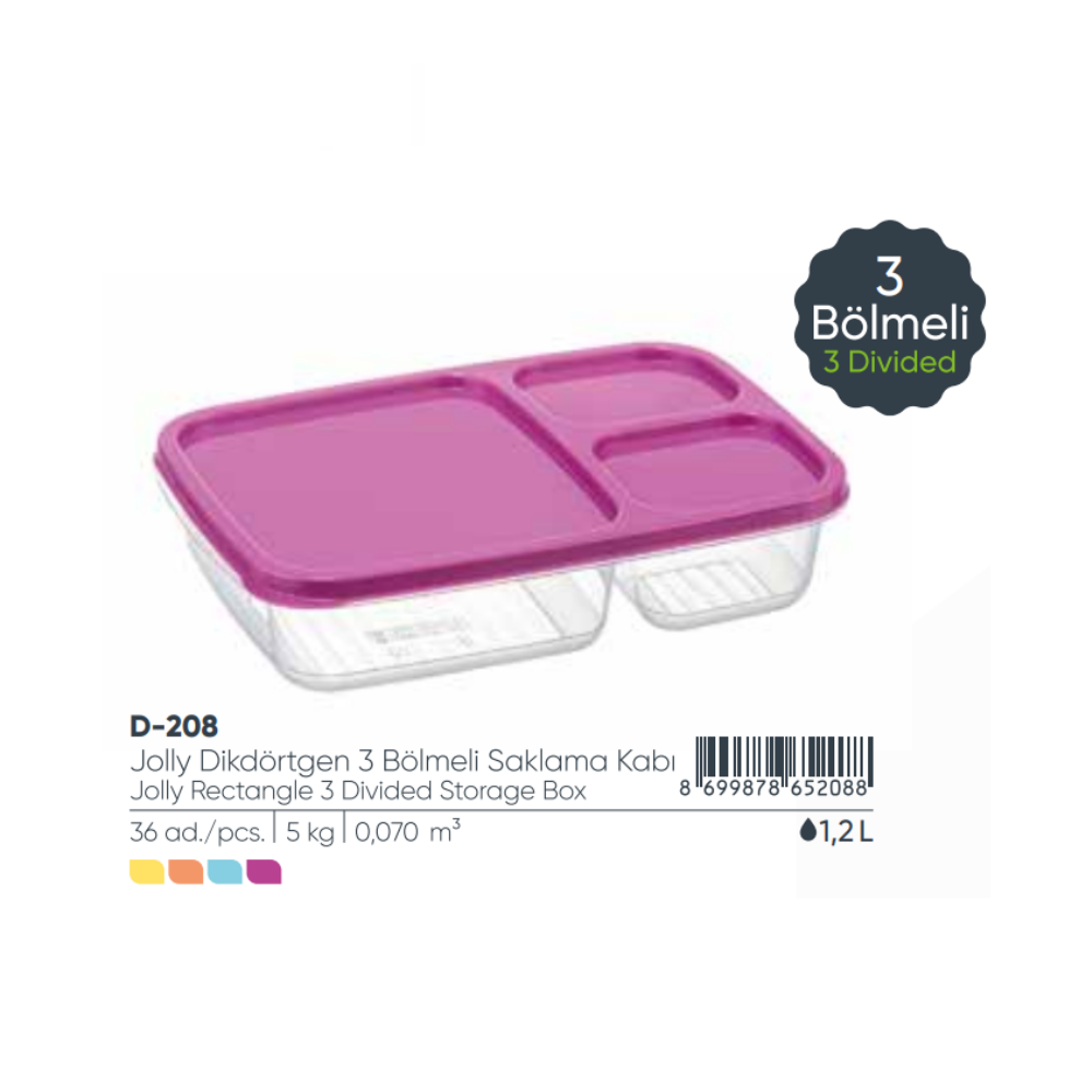 Jolly 3 Divided Rectangle Storage Container w Lid 1.2 Lt.