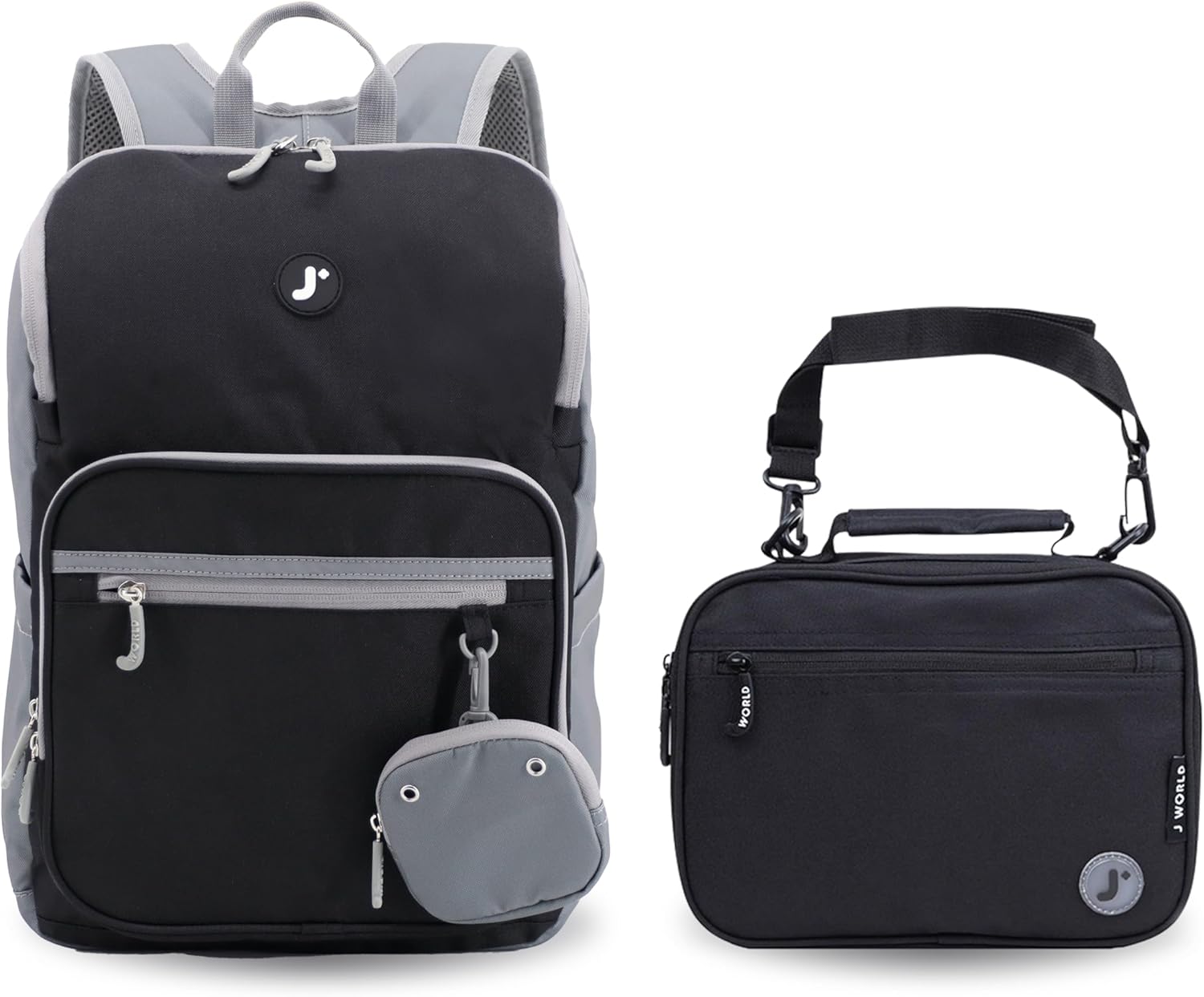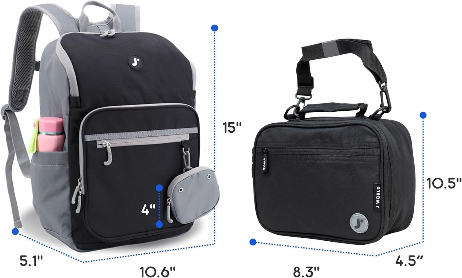 Junior Backpack+Lunch Bag 3pc Set Black Backpack 15 Lunch Bag 8in