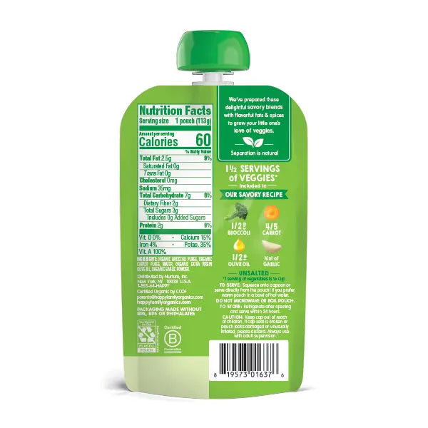 Help grow baby’s love of veggies with Happy Baby Savory Blends—organic baby food featuring 1½ servings of vegetables*, with flavorful fats and herbs to deliver big on taste! Our recipes combine bold ingredients like Broccoli & Carrots with Olive Oil & Garlic in a convenient pouch. USDA organic, non-GMO.