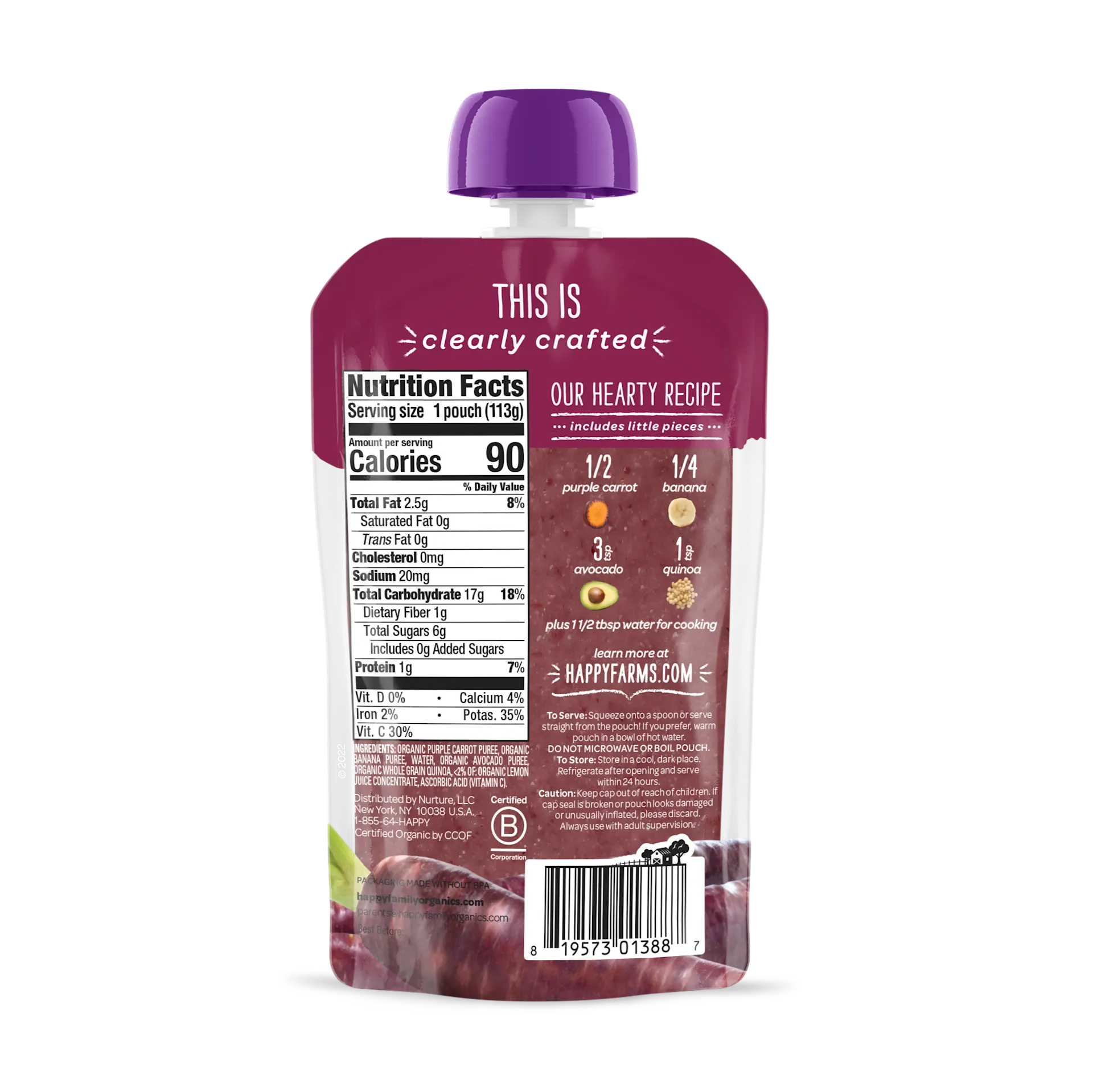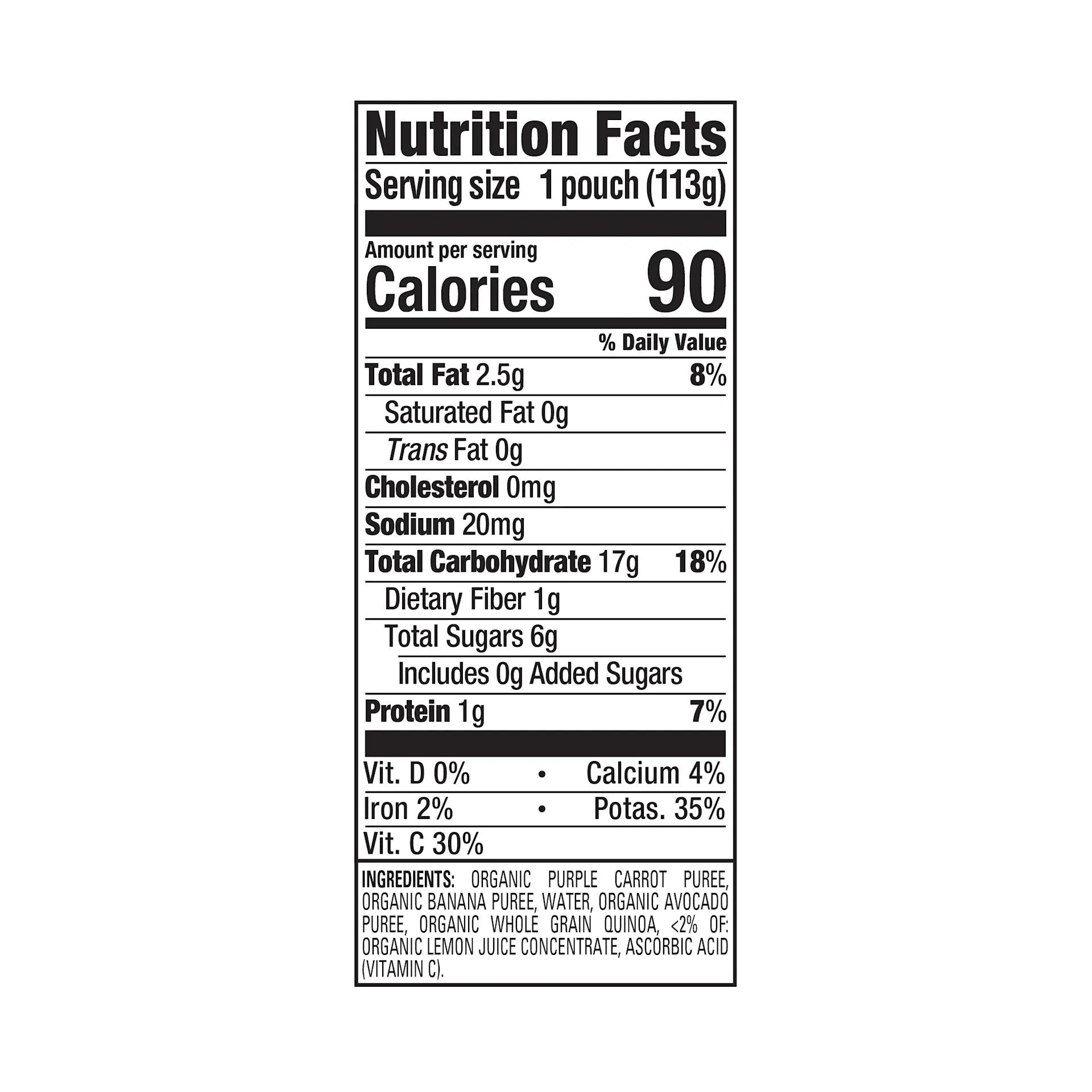This pouch contains a medley of organic purple carrots, mashed bananas, creamy avocados, and wholesome quinoa for a just-sweet-enough puree for baby.