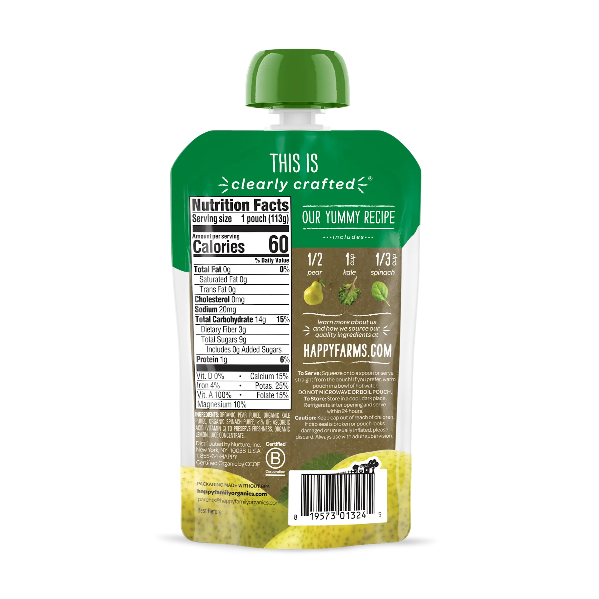 Organic superfoods for your super baby. We combine farm-picked kale with savory spinach, then delicately balance both with naturally sweet organic pears for a deliciously simple, fruit & veggie recipe in a convenient pouch.