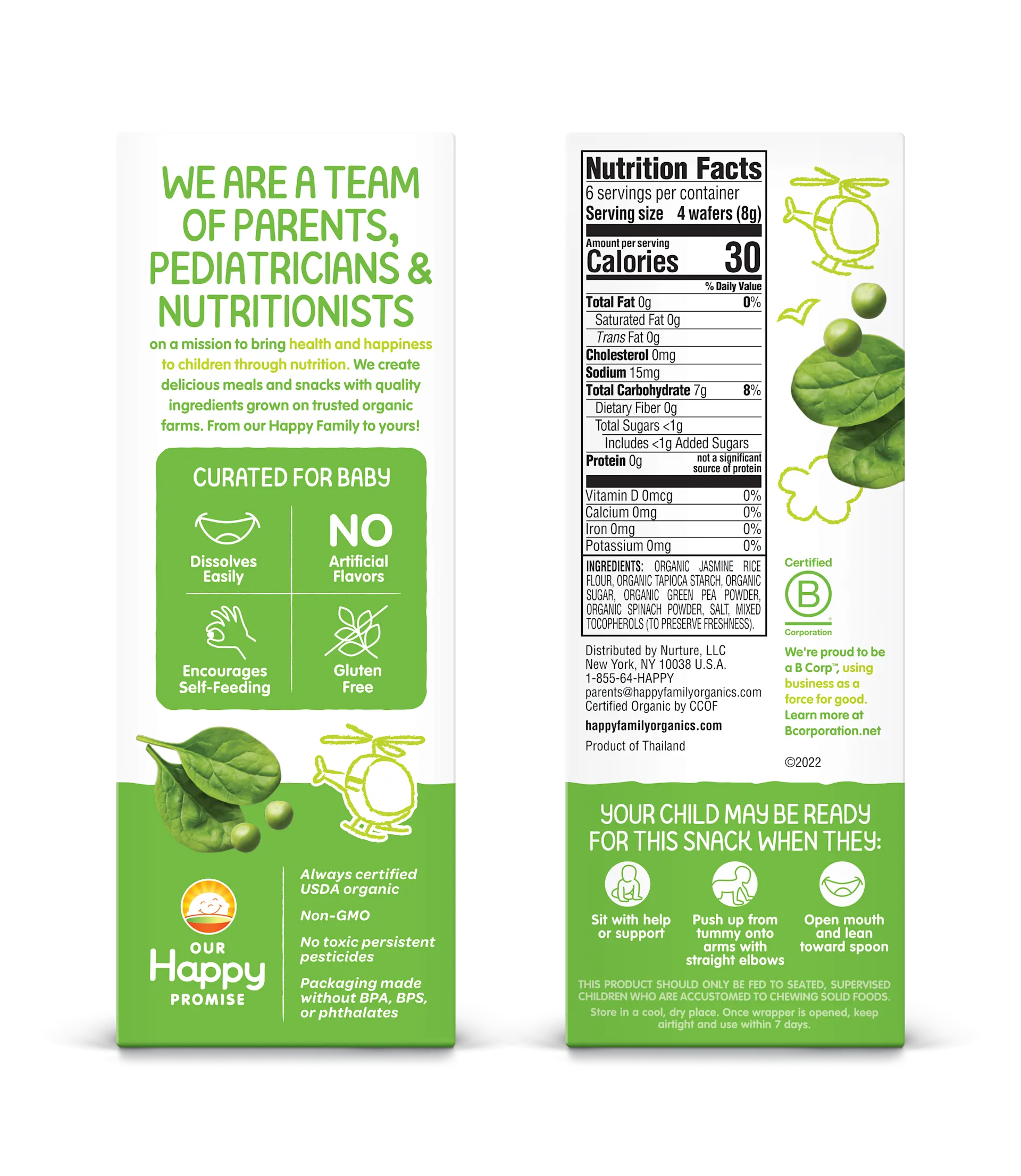 Made with jasmine rice flour and veggies, our pea & spinach teething wafers dissolve easily, making them a great first snack for baby’s developing gums.
