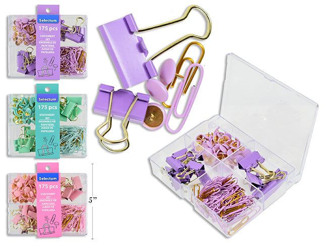 Set Contains clips, push pins and paper clips. Colours Pink, Purple and Green.
